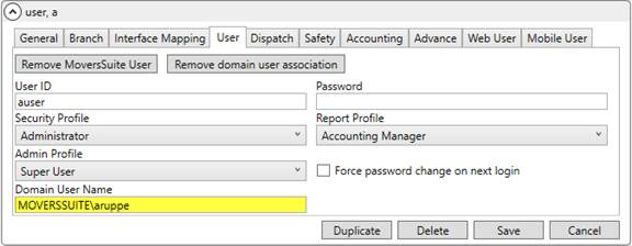 Administrators can view the Windows environment associated to the user through the Domain User Name field found on the User tab within Personnel Setup. In the example below (Figure 23), the record is authenticated through the MOVERSSUITE domain for the aruppe user. This is the domain user that the person logged into Windows using.