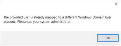 There can be only one user record associated to a Windows domain user. So, if your Windows domain or user name changes and you attempt to login, you will receive an error indicating that your user record is already mapped to a different Windows domain user.