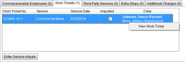 The Work Tickets tab within Order Information (Revenue Entry) displays local services containing actual revenue that a user can import into Revenue Entry through the Import Actuals function. Data displayed within this tab is created through Local Services and Local Dispatch.