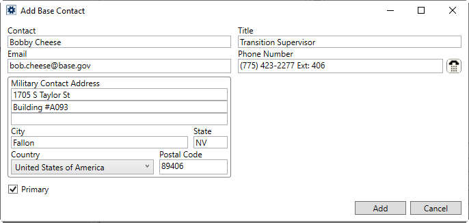The contact marked as the Primary displays in bold font in the contact listing for the base. The Primary contact is also the one available for base and carrier contacts through several Military Bookmarks.