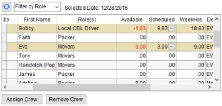 Note: It is possible to assign work beyond the hours available and beyond the 24-hour work period for contractor work, etc. When workers are assigned beyond their availability, the crew data grid will show this overage as a negative value (in red font).