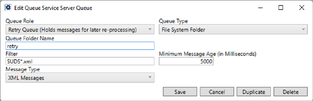 Provide the sub-directory for message files that failed to download and are placed in a queue to re-attempt the download. This sub-directory lists beneath what is specified for the Parent Folder for File System Queues. For example, if you set this to retry and the parent folder is D:\QueueService\AtlasMQ, then the application puts the retry files within the D:\QueueService\AtlasMQ\retry directory.