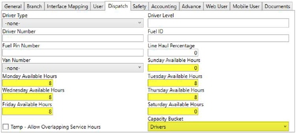 Once personnel are assigned to the service through Local Dispatch, then the application looks at the individual hours for each assigned person. For Capacity Planning, the application references the seven Available Hours settings and the Capacity Bucket setting within the Dispatch tab in Personnel Setup.