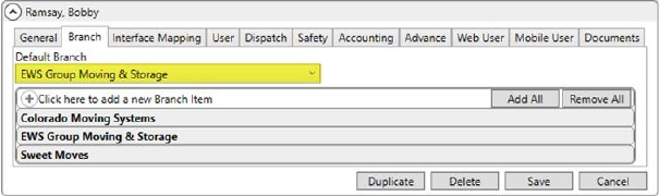 Figure 17: Branch tab in Personnel Setup