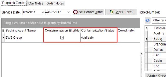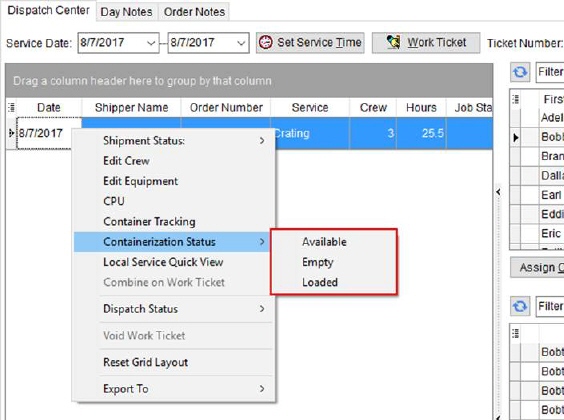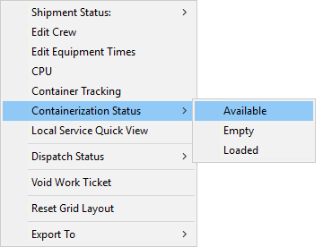 If your company directly packs shipments into containers, such as liftvans, then you have the option to set and update the status of services that are container eligible. Services that have the Container Eligible flag set within Local Service Type Setup can have a Containerization Status assigned to them through the right-click option available from main Dispatch Center grid within Local Dispatch.