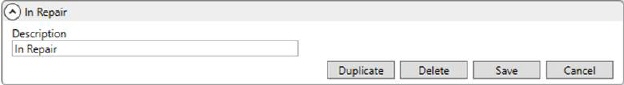 Use this setup to define the values available to indicate the state a container is in, e.g. “In Repair.” These values are assigned to a container through Container Setup and Container Management. Refer to Container Tracking Setup for more information.