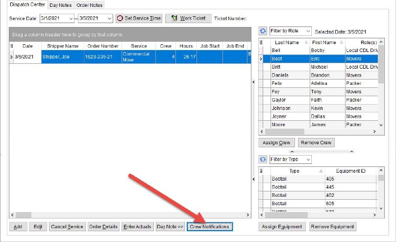 •The Crew Job Notifications screen is accessible through the Crew Notifications button present below the Dispatch Center tab within the Local Dispatch module.