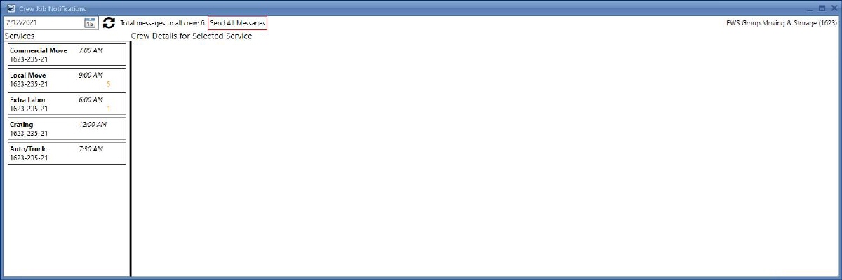 To start using the feature, you need to have at least one service with at least one crew member assigned to it. By clicking the Crew Notifications button, the main reference screen of the feature opens up. The screen loads the service details in the Crew Details for Selected Service table for the branch chosen and all the services listed in the Dispatching Common View.