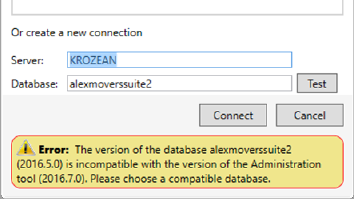If the version of MoversSuite database referenced is not compatible with the version of MoversSuite Administration, then the dialog produces an error indicating the incompatibility.