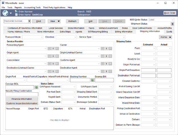 Users can manage information related to international orders through two tabs: Shipping Information and Container/Lift Van/Airbox Information. Shipping Information details the transportation sources, port data, service providers, all shipping dates, etc., while the Container/Lift Van/Airbox Information tab documents the specifics of containers, lift vans, and air boxes associated to an international move.  Data entered can quickly be accessed through custom documents generated using bookmark fields, used to generate quotes, or exchanged with a third-party application (van line).