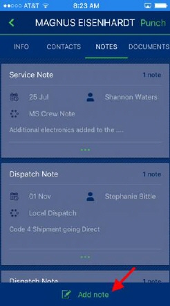 Notes for the service can be added through the Notes screen within MSCrew. Pressing Add Note opens a screen allowing you to specify the subject and body of the note.