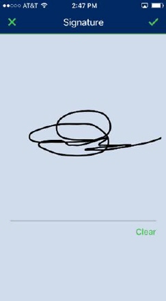 Clicking on Client signature opens the Signature capture screen. You can use your finger or soft pencil or stylus to sign your name. Finish by pressing the green checkmark (upper right-hand corner). If you need to resign, you have the Clear option or you can press the X (upper left-hand corner) to restart the process.