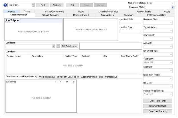 The Order Information (Office & Industrial) tab in Revenue Entry provides the user with the ability to set a revenue clerk and confirm key billing data such as move type, commodity, customer being billed as well as view the key locations, commissionable employees, contacts, and more.
