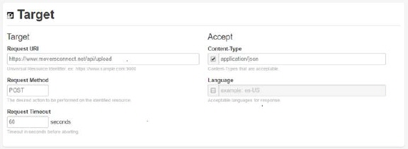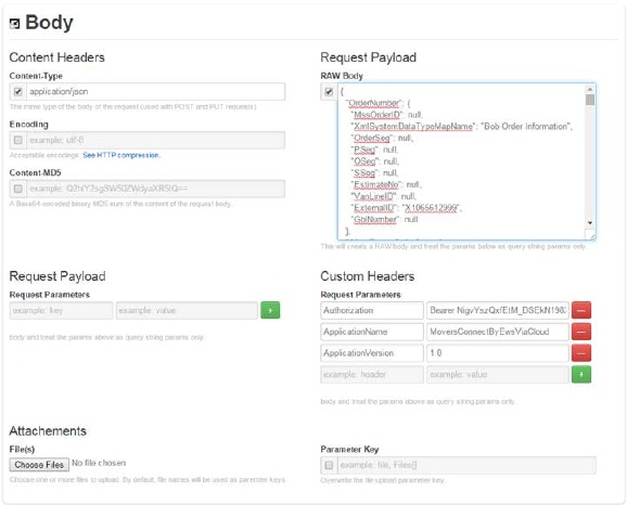 Place the upload request data in this section using appropriate format (JSON/XML). The following is portion of a lead request in JSON format. { "OrderNumber": { "MssOrderID": null, "XmlSystemDataTypeMapName": "Bob Order Information", "OrderSeg": null, "PSeg": null, "OSeg": null, "SSeg": null, "EstimateNo": null, "VanLineID": null, "ExternalID": "X1065612999", "GblNumber": null },...