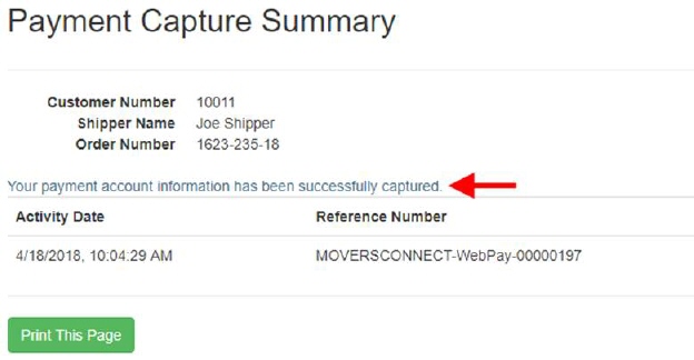 Once a payment capture is successful through the Online Payment site, then this summary page displays. It provides information on whether the payment capture was successful or not along with an option to print the information.