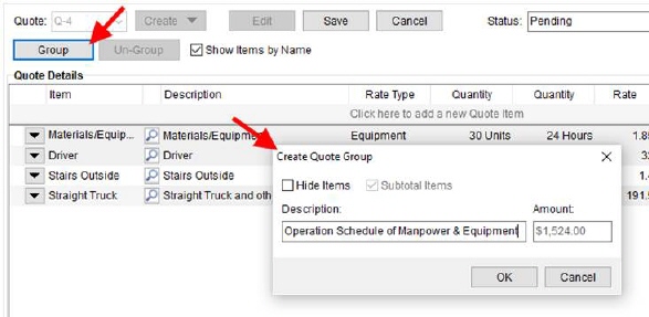 Use the Create Quote Group to combine one or more quote items into a single line item (Hide Items checked) or list all the items under a specific Description. Optionally, provide a dollar Amount when Hide Items is checked and Subtotal Items is unchecked; use this if you wish to list the items without charge and write-in your own dollar amount for the collection of items.