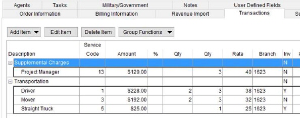 The Quote tab is available throughout MoversSuite including Order Information, Revenue Entry, and Claims. This tab allows you to define quote items for one or more quotes per order. Options available to you include the ability to create a new quote based on an existing one, duplicate line items, generate groups of quote items, view quote report, and more.