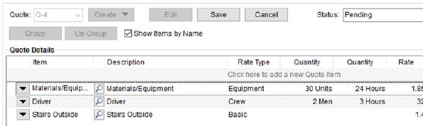 NOTE: Only detail line items are stored within a quote template. Any groupings in place are not saved to the template. Groups must be manually added to a quote.