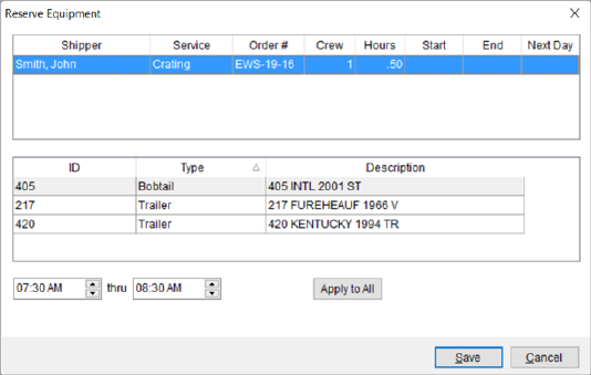 The screen prompts you to provide the starting and ending time that the specified resources are to be allocated. Enter the Job Start Time and Job End Time accordingly. If the times apply to all listed equipment, then set the time for the other resources by pressing Apply to All.