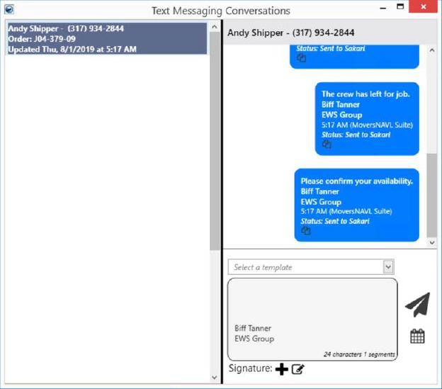 •A Template Message can be added in your text messages through a dropdown menu, for faster and easier communication. Use Sakari Template Setup option in MoversSuite Administration to add new templates.