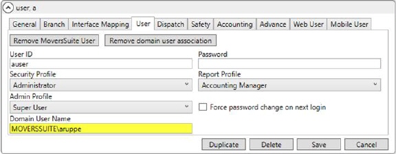 Administrators can view the Windows environment associated to the user through the Domain User Name field found on the User tab within Personnel Setup. In the example below (Figure 23), the record is authenticated through the MOVERSSUITE domain for the aruppe user. This is the domain user that the person logged into Windows using.