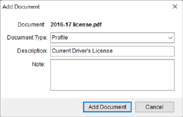 The Add Document dialog allows you to set the document properties and confirm the addition of the document to the system. This dialog appears when choosing Add Document from within the following areas: