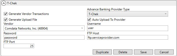 Figure 21: Advance Banking Provider Setup for T-Chek