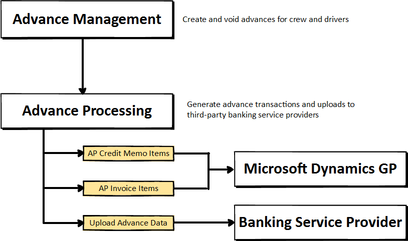 The following image illustrates the flow of an advance transaction from its creation in Advance Management to Microsoft Dynamics GP and banking service provider.