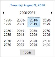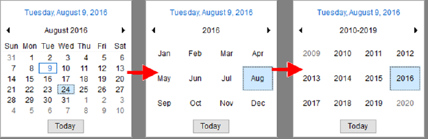 Zoom out to different months, years, and decades by clicking on the month and year link. In the illustration below, clicking on “August 2016” produces a monthly view, then clicking on “2016” produces a yearly view, etc. For each view, you can select the appropriate item, such as “Feb” for February and continue to drill down into the daily view.