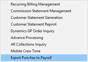 MoversSuite integrates with external providers to furnish punch activities from MSCrew for payroll processing. The option to export the punch activity is available through the Export Punches to Payroll screen.