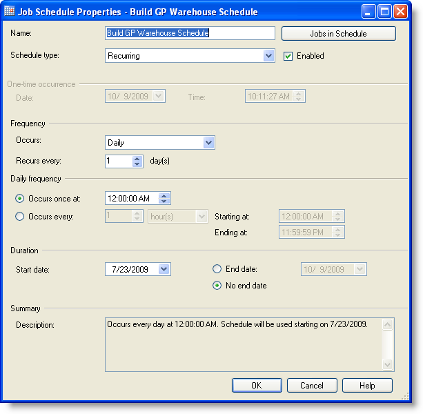 By default, the BUILD_GP_WAREHOUSE job runs daily at midnight. Users can update this time through the Properties window available by double-clicking the job name or by right-mouse clicking the job name. Specifically, from the Properties screen, select Schedules and then Edit to view and change the job scheduling properties.