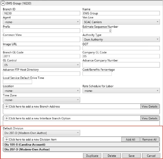 This is a special section within a MoversSuite Administration > Branch Setup > Branch record that is only visible when the Divisions are turned on. Refer to Divisions Setup and Administration for setting up Divisions. You can use this section to link the current branch record to Division records (defined within Division Setup).  These Division records will appear as options on orders and transactions associated to the branch.