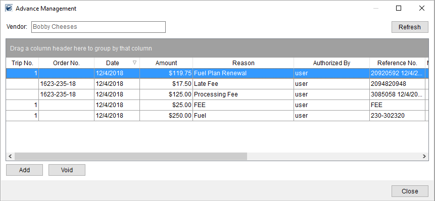 The Advance Management screen is available to dispatchers within the Local Dispatch and Long Distance Dispatch modules. You can use this screen to add and void advances for a specific employee for trips or orders.