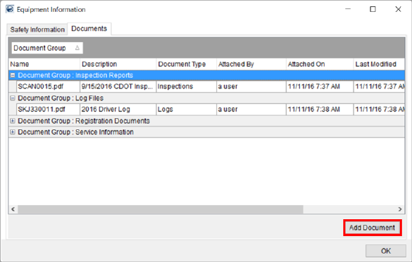 You can add and view documents for personnel through the Documents (Equipment) tab within the Equipment Information screen.
