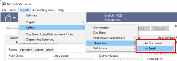 Choosing As Email opens the letter within a new MoversSuite Email window.
