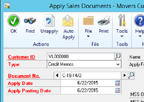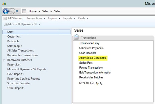 In Dynamics GP, choose Apply Sales Documents from the Sales pane