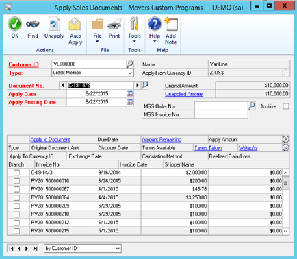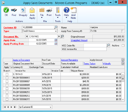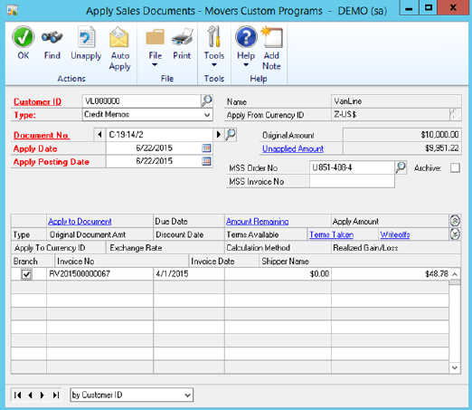 Note the Unapplied amount of the credit memo has changed to 9951.22 and the Amount Remaining on the RV2015 document has changed to 0.00
