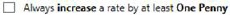 Choose from this menu to set how the updated rate is rounded. The amount is rounded up regardless of whether the Change By option increased or decreased the amount. The menu options include: Penny (default): This option will round up to the next penny.