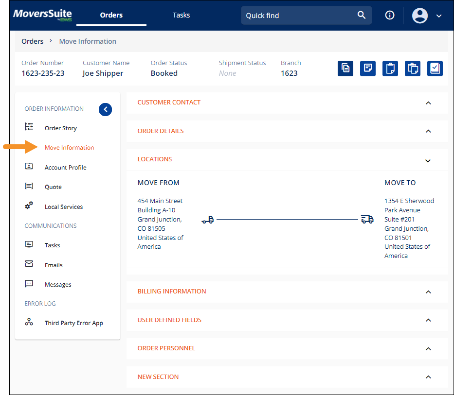 Information entered when beginning the order or lead will list within “sections.” If not already entered, the services will initially list under the New Section at the bottom of the page. See MSWeb New Section for details on adding sections. Additionally, a listing of all the fields within Move information is found at MSWeb Fields.