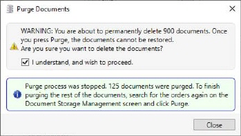 With orders narrowed down to your desired results, you can click the ‘Purge Documents’ button on the Document Storage Management Setup screen. As this is a permanent delete and an irreversible process, a warning is displayed for you to confirm the action.