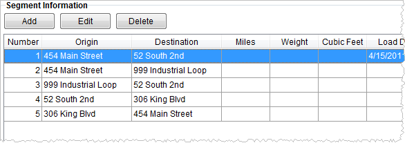 Segments link one defined location to another. The locations must be associated to the order as the Moving To and Moving From address set on the Name, Address, Phone tab or those defined through Extra Stops. Additionally, users can establish weight, miles, and cubic feet values and pack, load, and delivery date ranges specific to segments.
