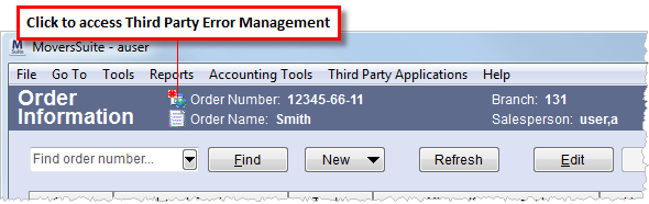 Users can access the Third Party Application Error Management screen through the main MoversSuite toolbar through Tools > Manage > Third Party Application Errors or through an open order in Order Information through the data exchange icon () information bar of any order.  Users can click on this icon to access the error management screen.  If the open order has a third-party error associated to it, then the gold sparkle of the icon will be colored red ().