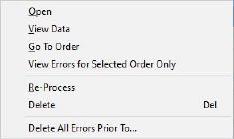 This function purges all errors other than the order that is open. The functionality duplicates that of the “Show Errors for Order XXX-XXX Only” checkbox present at the bottom of the screen.
