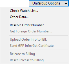 The UniGroup Options menu items are arranged in a workflow designed to guide you through the life of an IBIL order. Starting out, you may wish to Check Watch List, which checks the customer name against those on a watch list within UniGroup International. At the end of the process, you can Release Billing. The following is a rough guide for processing UniGroup International IBIL orders within MoversSuite.