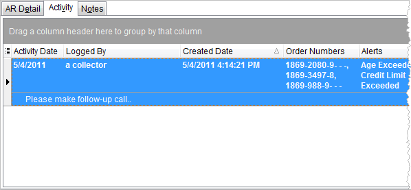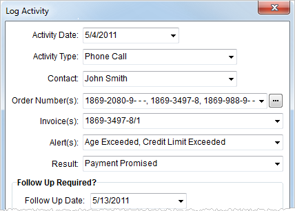 Activity can be logged for each customer that tracks correspondence and creates an accurate history of collections and other interactions between the company and the customer. As with notes, activities will be based on a particular data and can be linked to multiple orders, invoices, and alerts. Additionally, a follow-up task can be generated directly from the Log Activity screen.