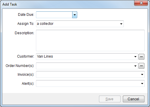 Tasks are associated to one customer and assigned to a single collector. They can also link to multiple orders, invoices, and alerts.