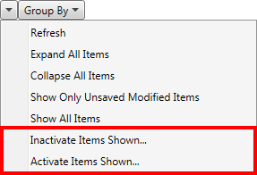 Options exist through the Mass Record Selection Options menu (), available in the upper right-hand corner of the screen that allow you to mark all records displayed in the grid as inactive or active. See Mass Record Selection Options for how to inactivate or activate multiple records at once.