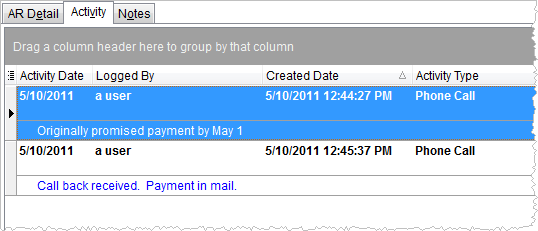 Use the Filter Activity/Note option to allow the application to display activity for a particular record selected within AR Detail.