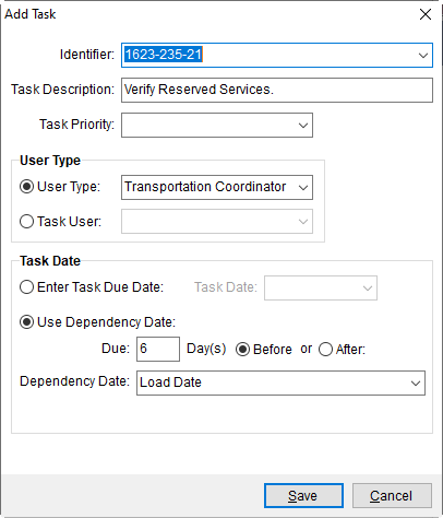 Utilize the Identifier to set the task to a logical grouping. This allows you to link new tasks to the correct group. For example, if your new task is one that you want associated to an Extra Stop, then you can choose one of either Pickup or Delivery types to link it correctly. This setting drives which Dependency Dates are available to the task, as well.