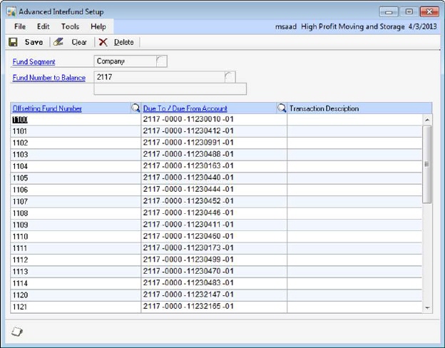 Advanced Interfund is an integrated Microsoft Dynamics GP product that enables you to track in your GL the due to and the due from between all segments. It tracks what each segment owes each other segment. For moving companies, you can track which branch owes another branch.